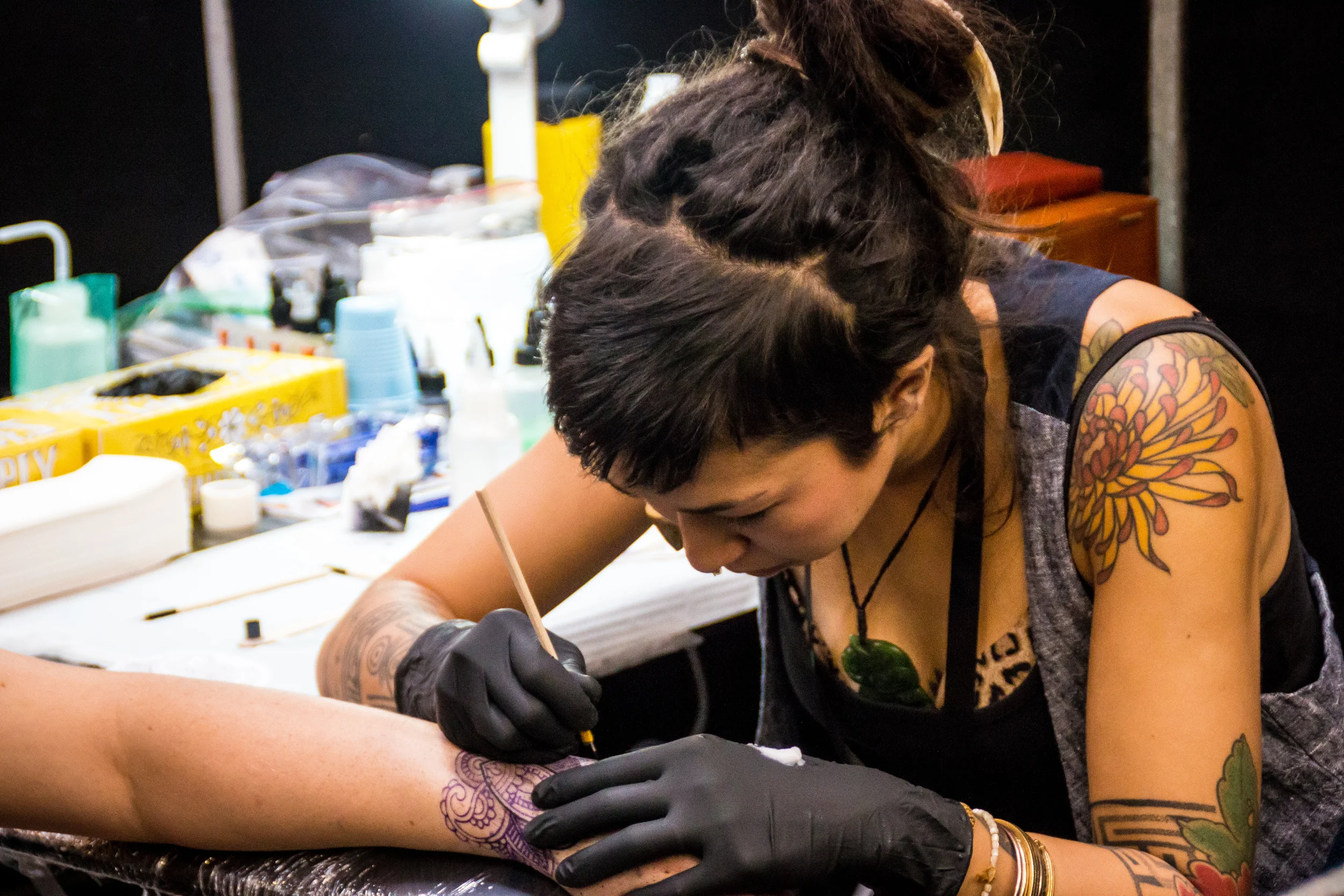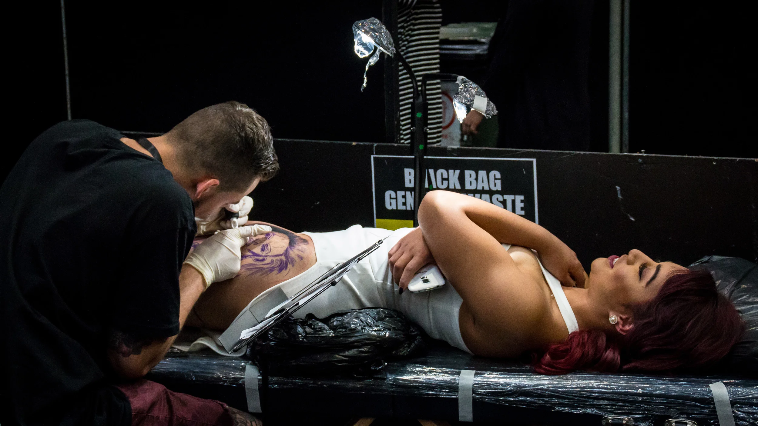 Le lendemain, à un jour de l'ouverture du festival, c'est au tour d'Alice et moi de donner un coup de main à mettre en place l'évènement. Au programme, déplacement de cartons, mise en place des chaises et surtout préparation des sauts destinés aux artistes tatoueurs. L'ambiance est vraiment relax, les organisateurs super cools et c'est le jour d'arrivée des artistes alors l'agitation commence à monter mais dégage une agréable énergie positive.