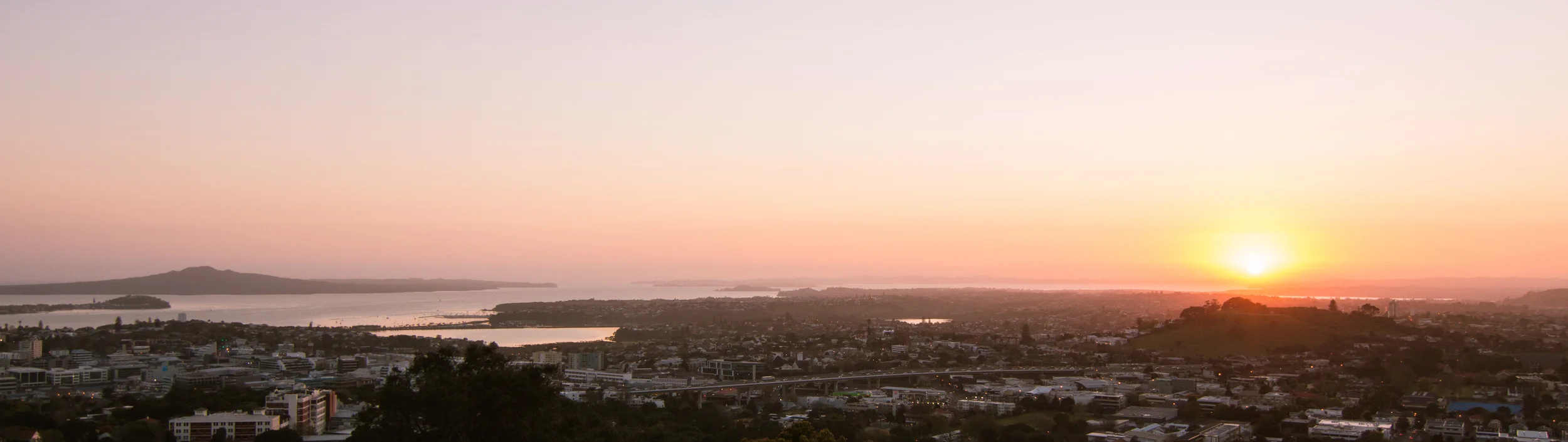 Mission Bay avec vue sur le dernier volcan entré en éruption, Rangitoto