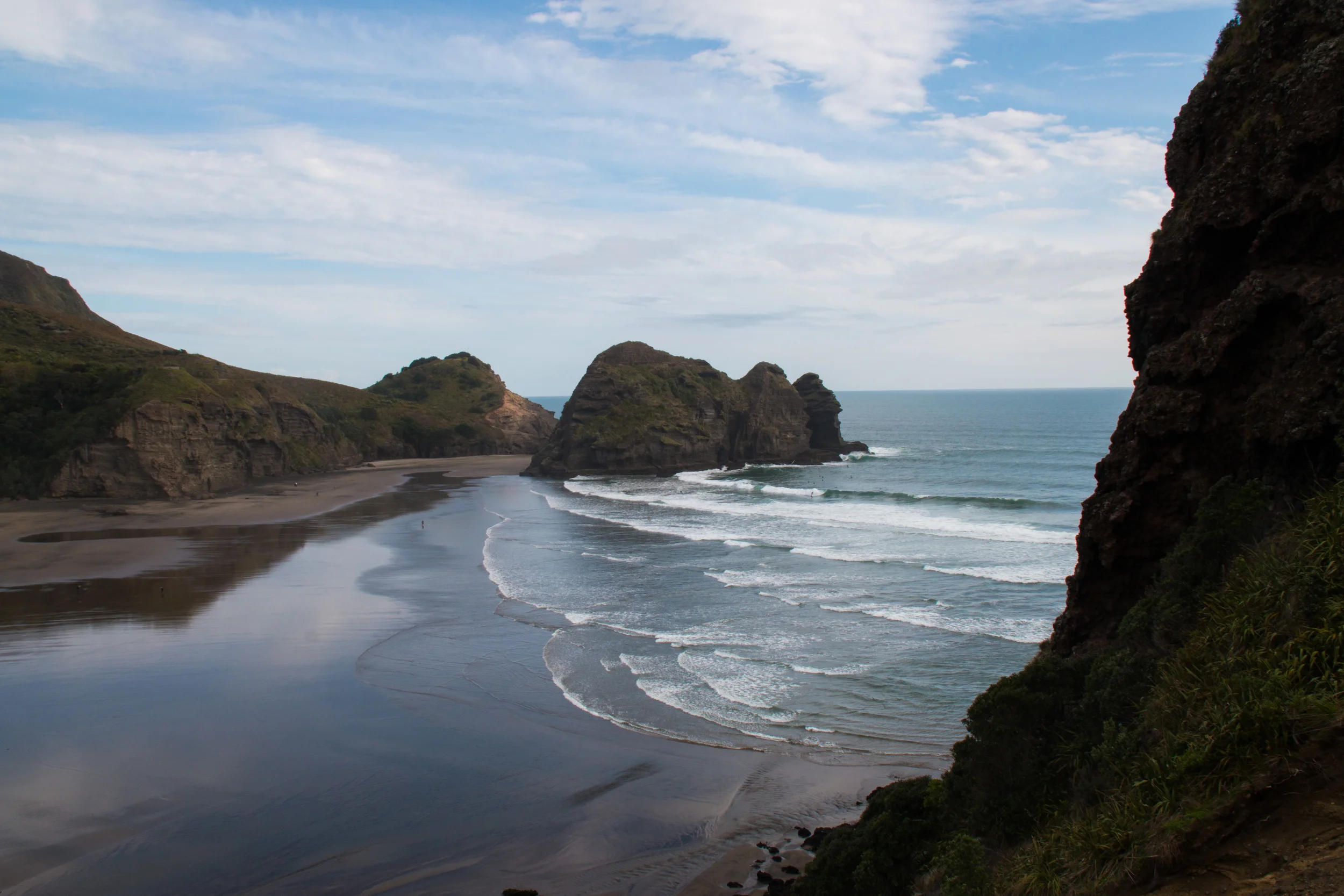 Le jour suivant, c'est trente minutes de route qui nous mènent du côté de Piha et Karekare. Un bon spot pour les surfeurs et pour ravir les yeux encore une fois. L'accès à ces endroits se fait par des routes secondaires escarpées qui rendent la conduite attrayantes. Les forêts de types tropicales (ou "Jurassic Park") nous ouvrent les portes sur les plages de sable noir. Malheureusement, nous n'avons pas eu la chance de voir de près des lions de mer, habitués à s'abriter du côté du rocher...aux lions de mer. Ce dernier est par contre accessible à marée basse et on peut l'escalader pour contempler le paysage de sa hauteur.