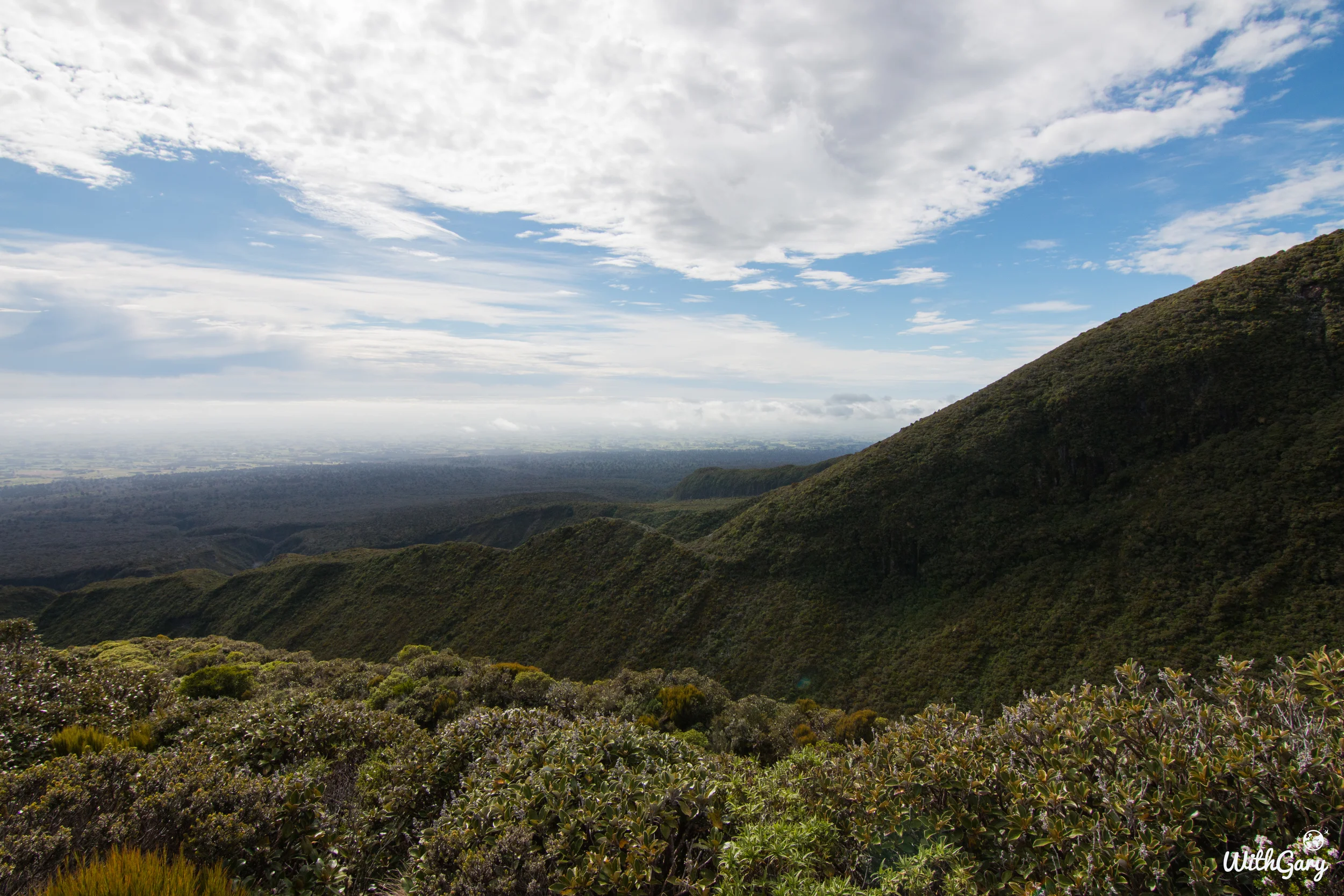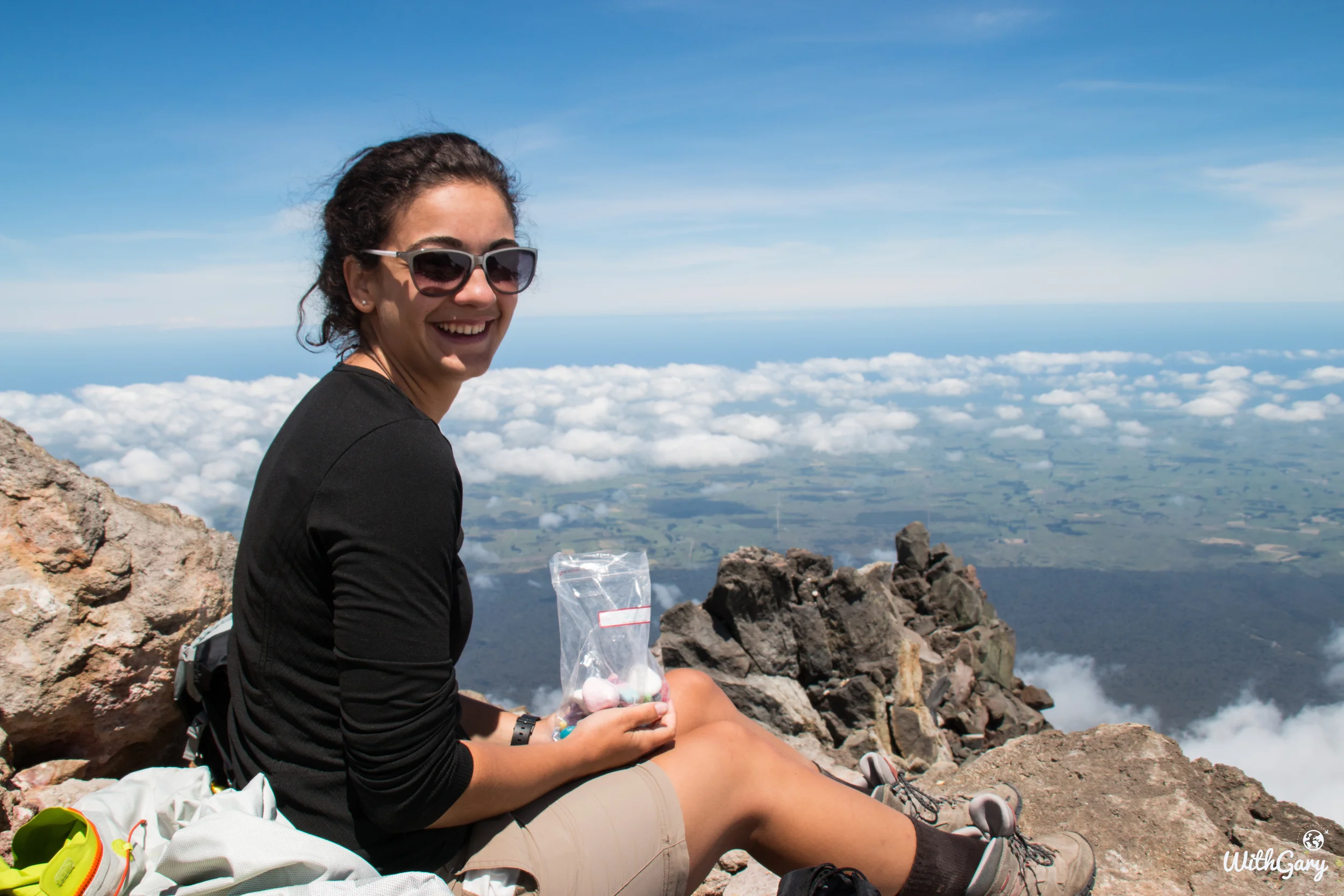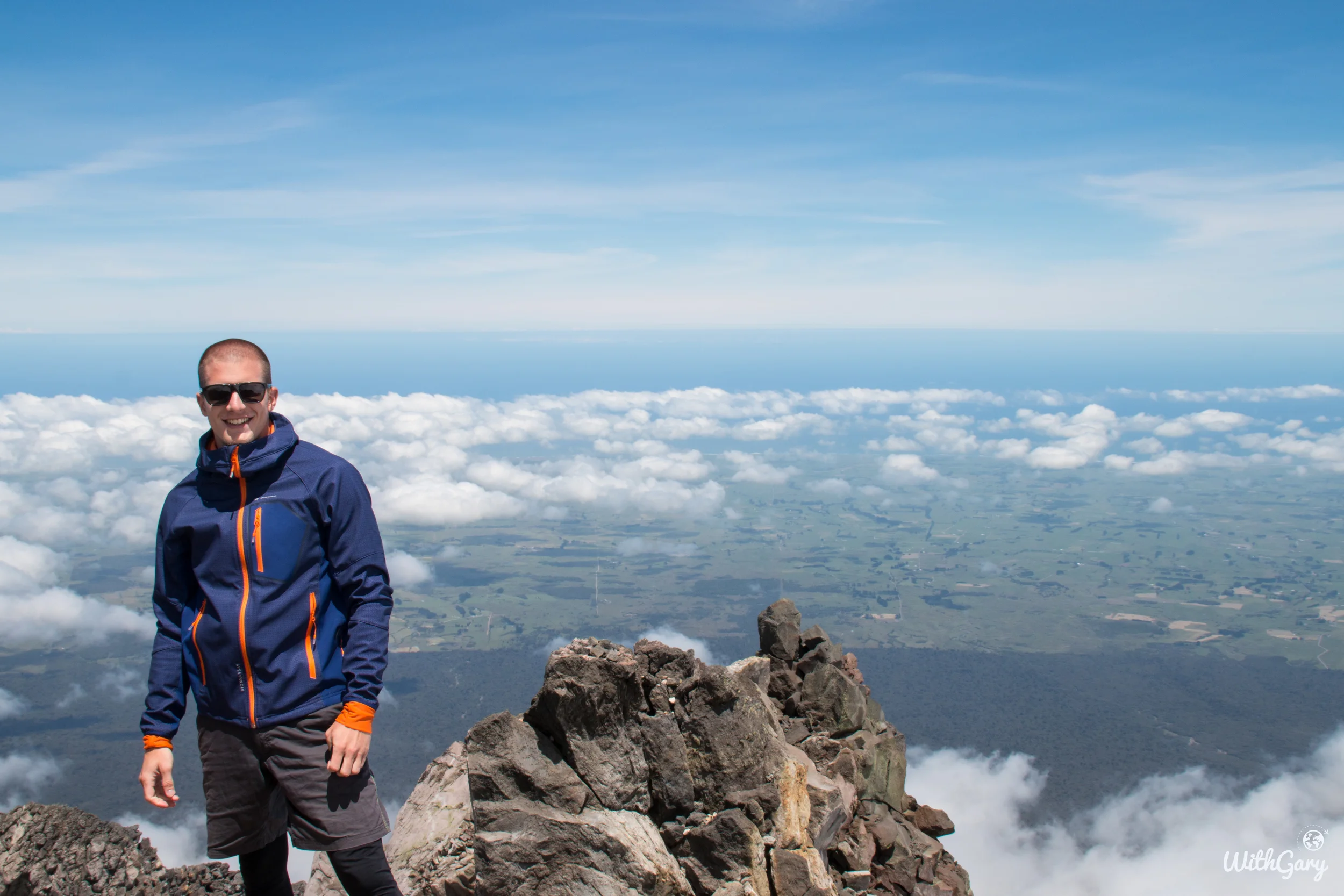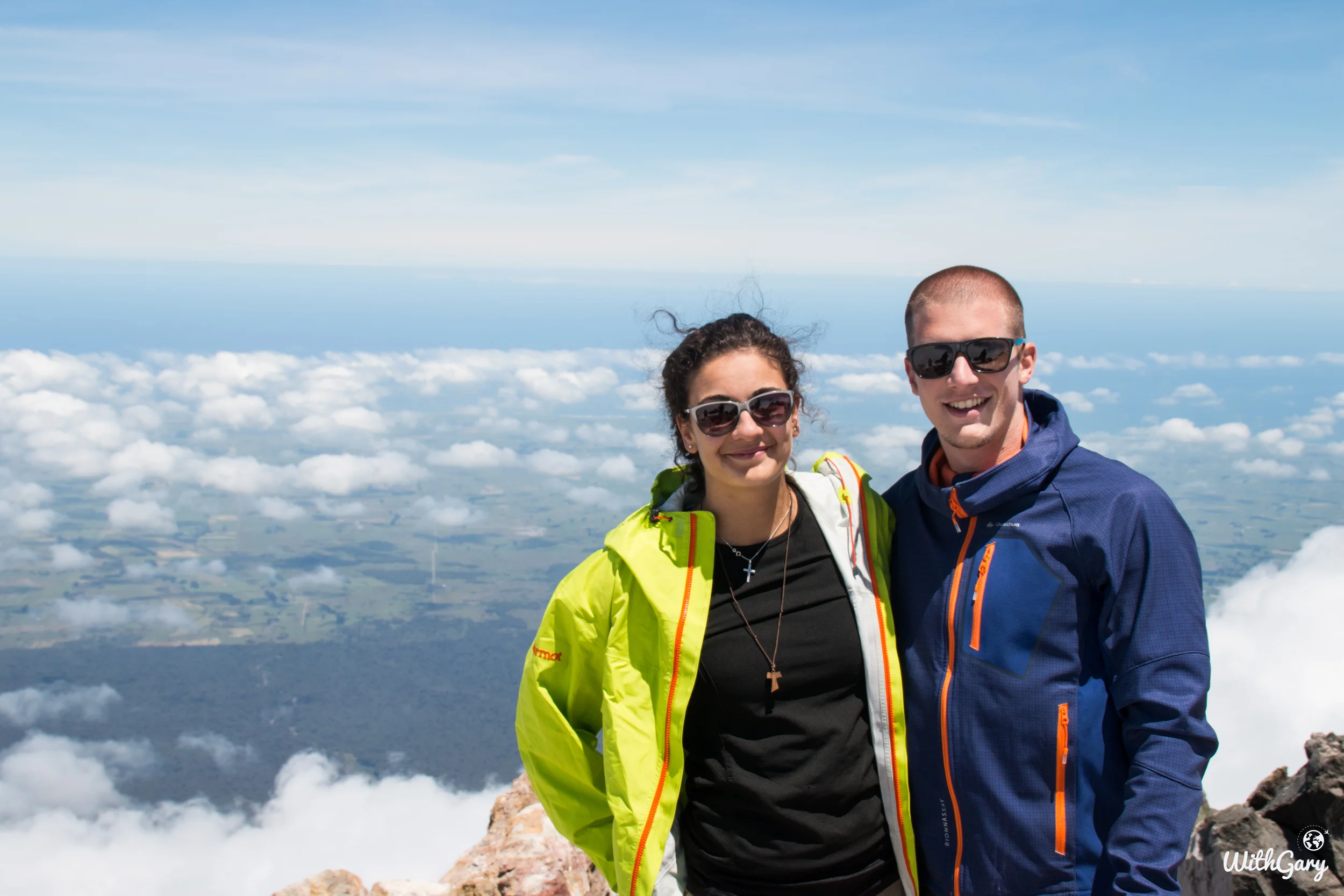 Tout comme pour le Tongariro, le début est plutôt facile mais au bout de deux heures les premières difficultés se font ressentir. Encore une fois, la pente est raide et le terrain glissant mais nettement plus abordable. On galère quand même 2 heures encore pour enfin apercevoir la neige qui recouvre le cratère. La vue se dégage et il ne nous reste plus que quelques mètres à escalader avant de prendre de pleine face la vue plongeante sur la région et la mer.