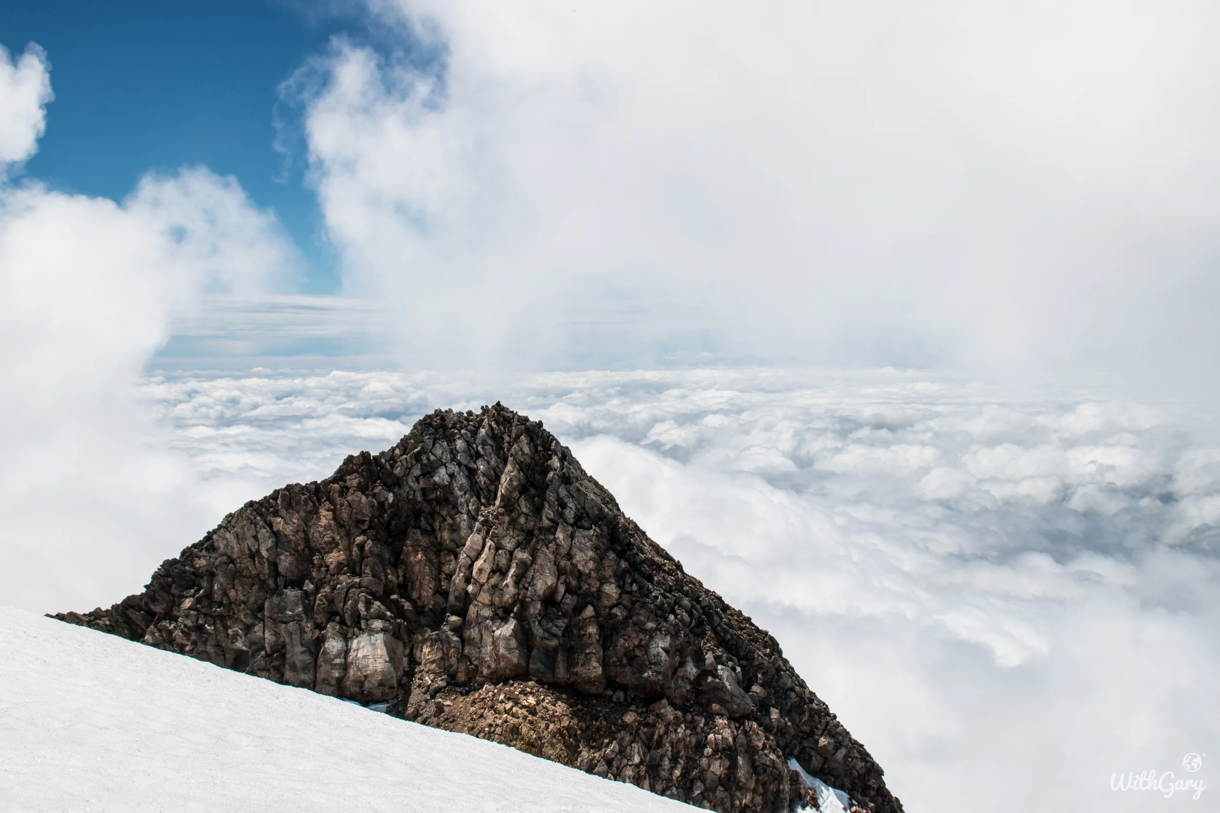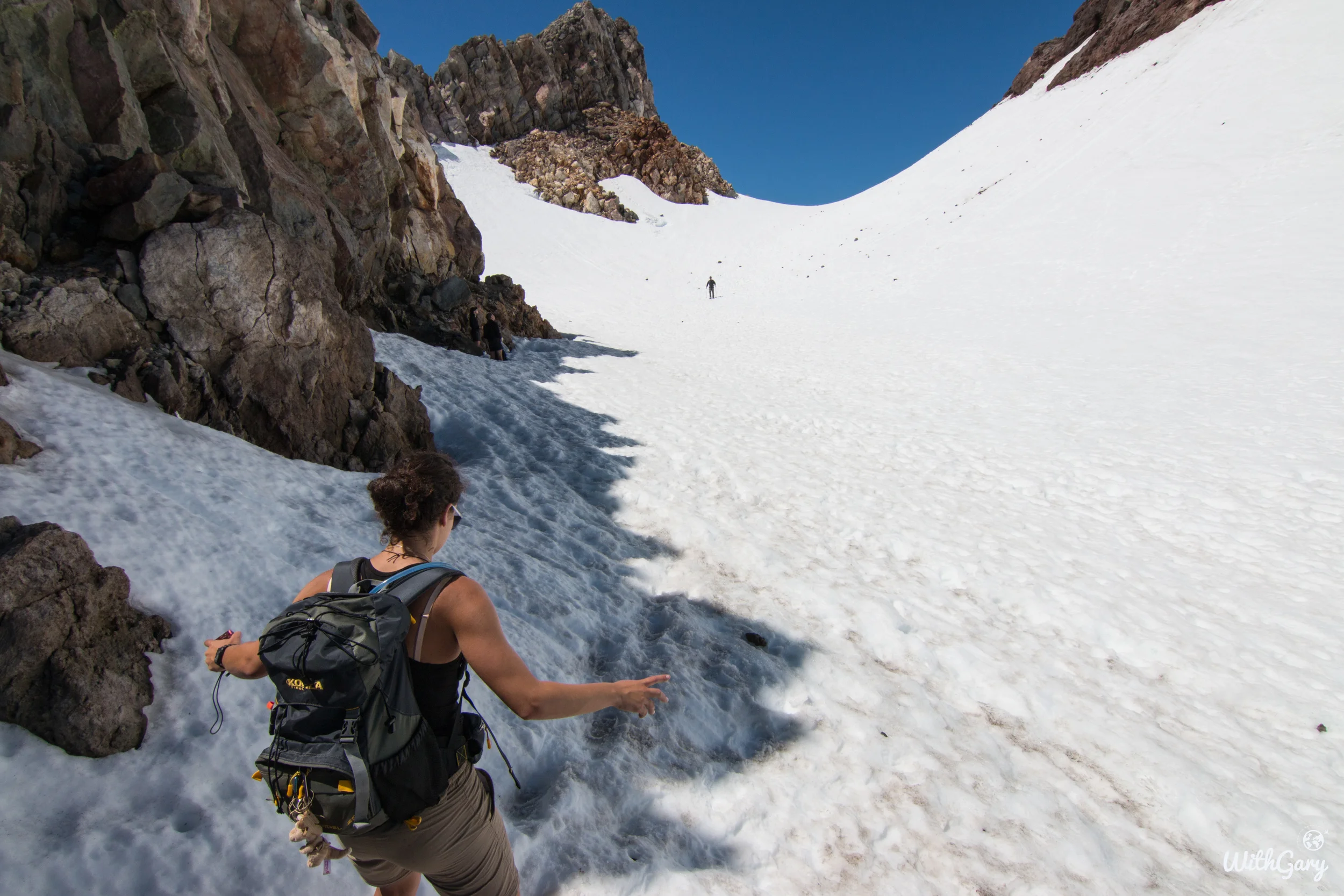On prend une bonne heure pour déguster nos sandwichs et le décor qui nous entourent. On a du mal à quitter ce petit coin de neige perché entre un plateau nuageux et un tapis d'eau. Après une bouffée d'air frais et de bonbons on se dirige vers la descente. Pour atteindre le cratère il suffit juste de s'asseoir et de se laisser glisser dans la pente. Après nous retrouvons nos cailloux, glissants aussi.