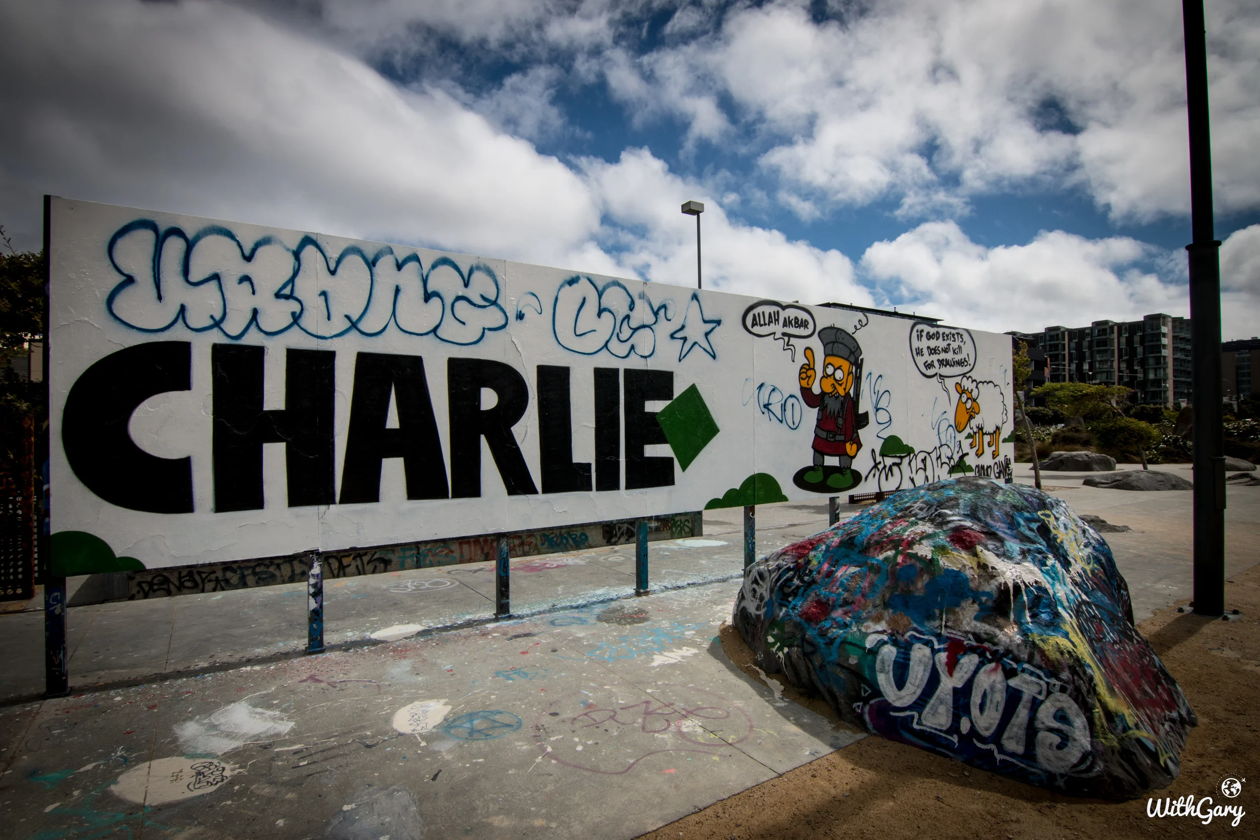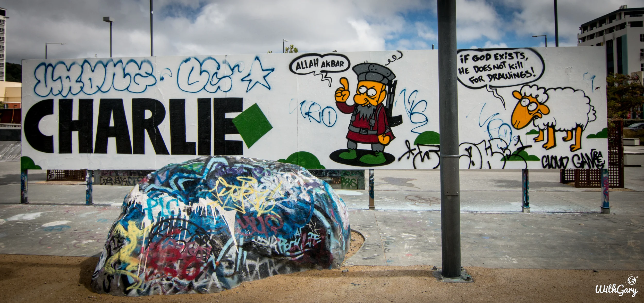 Lors de mon second passage dans la ville ont lieu les dramatiques événements à Paris qui résonnent jusqu'ici. Un artiste a rendu hommage au coeur du centre ville, à 18000 km du lieu des faits.