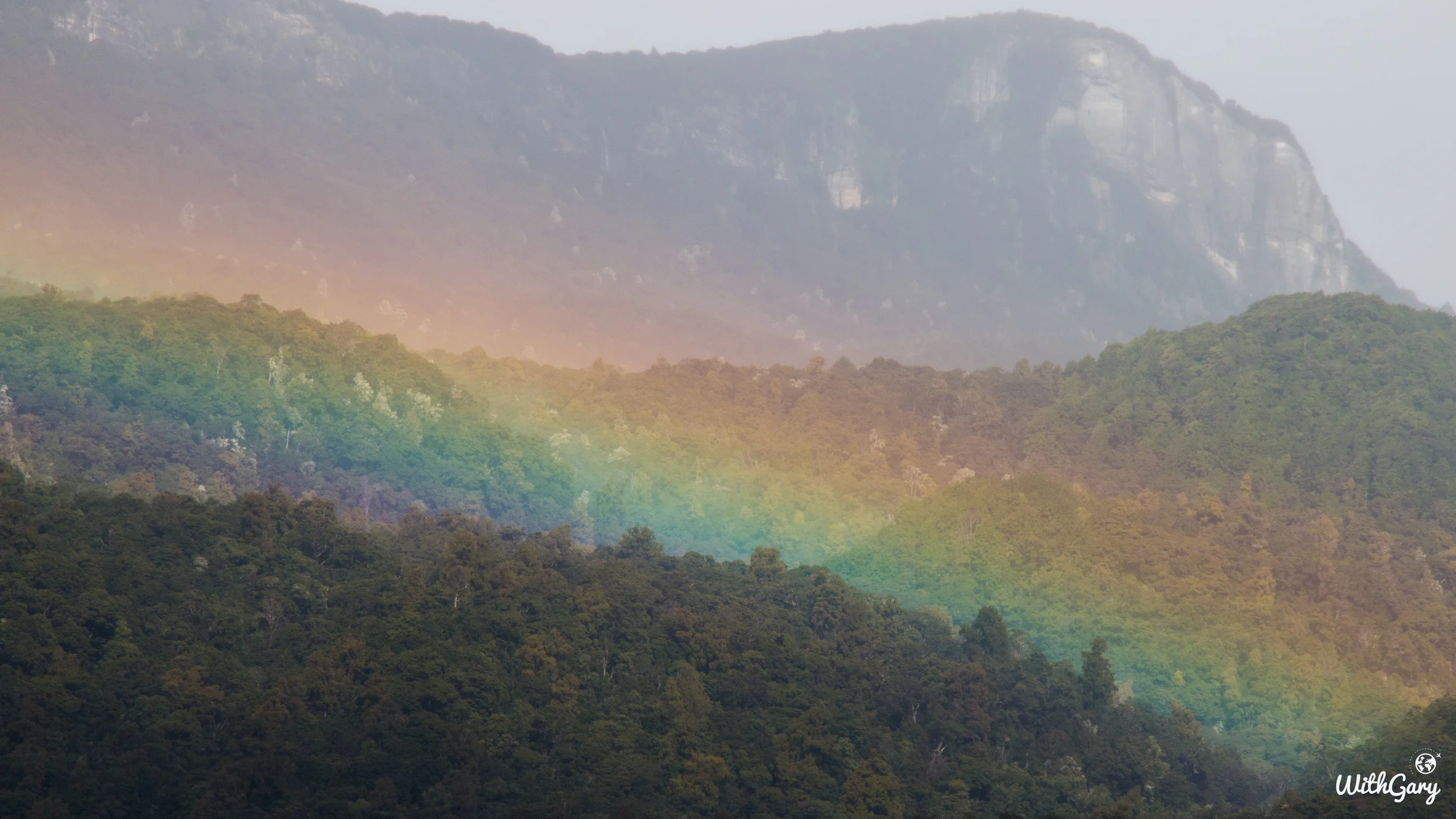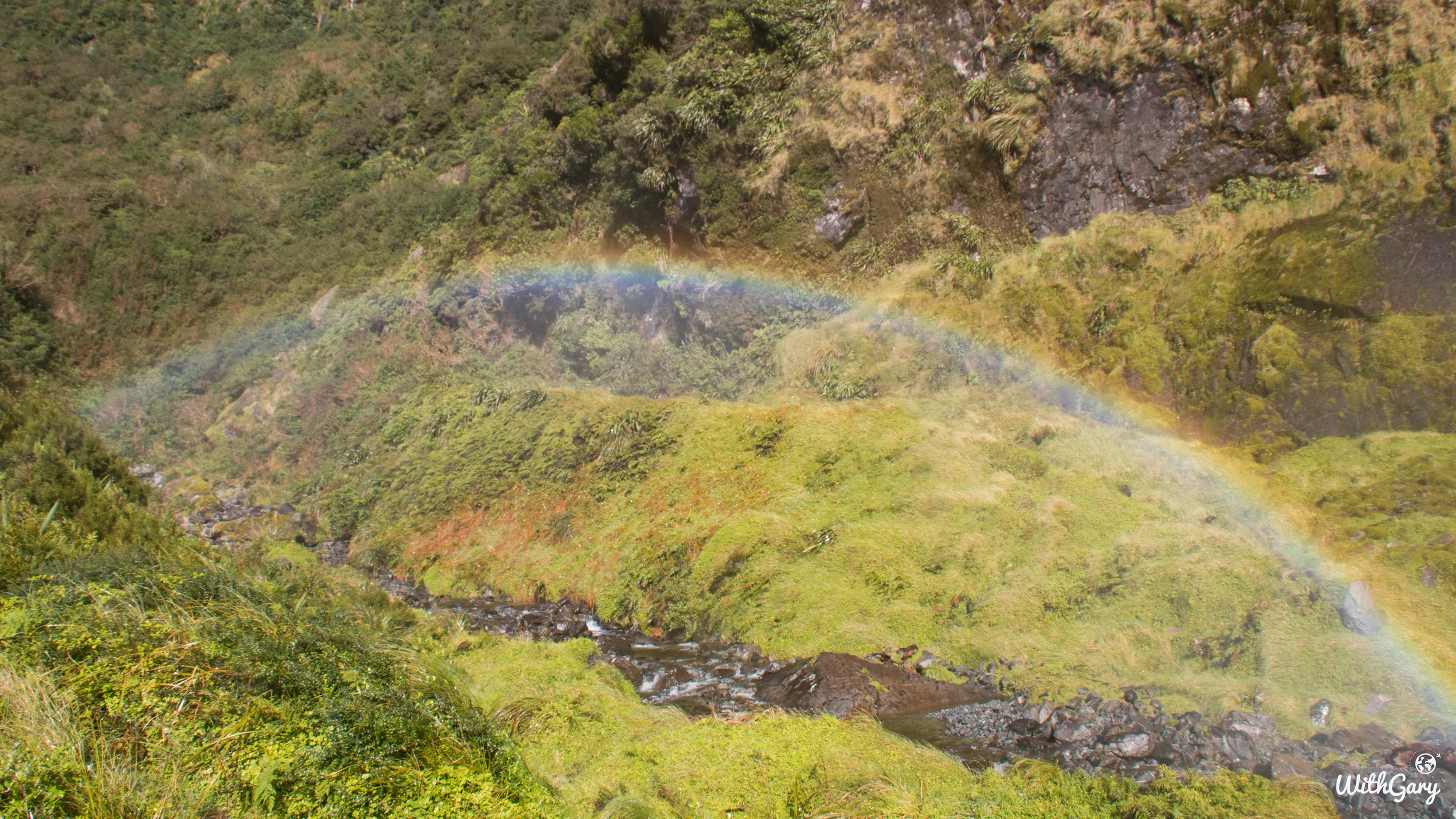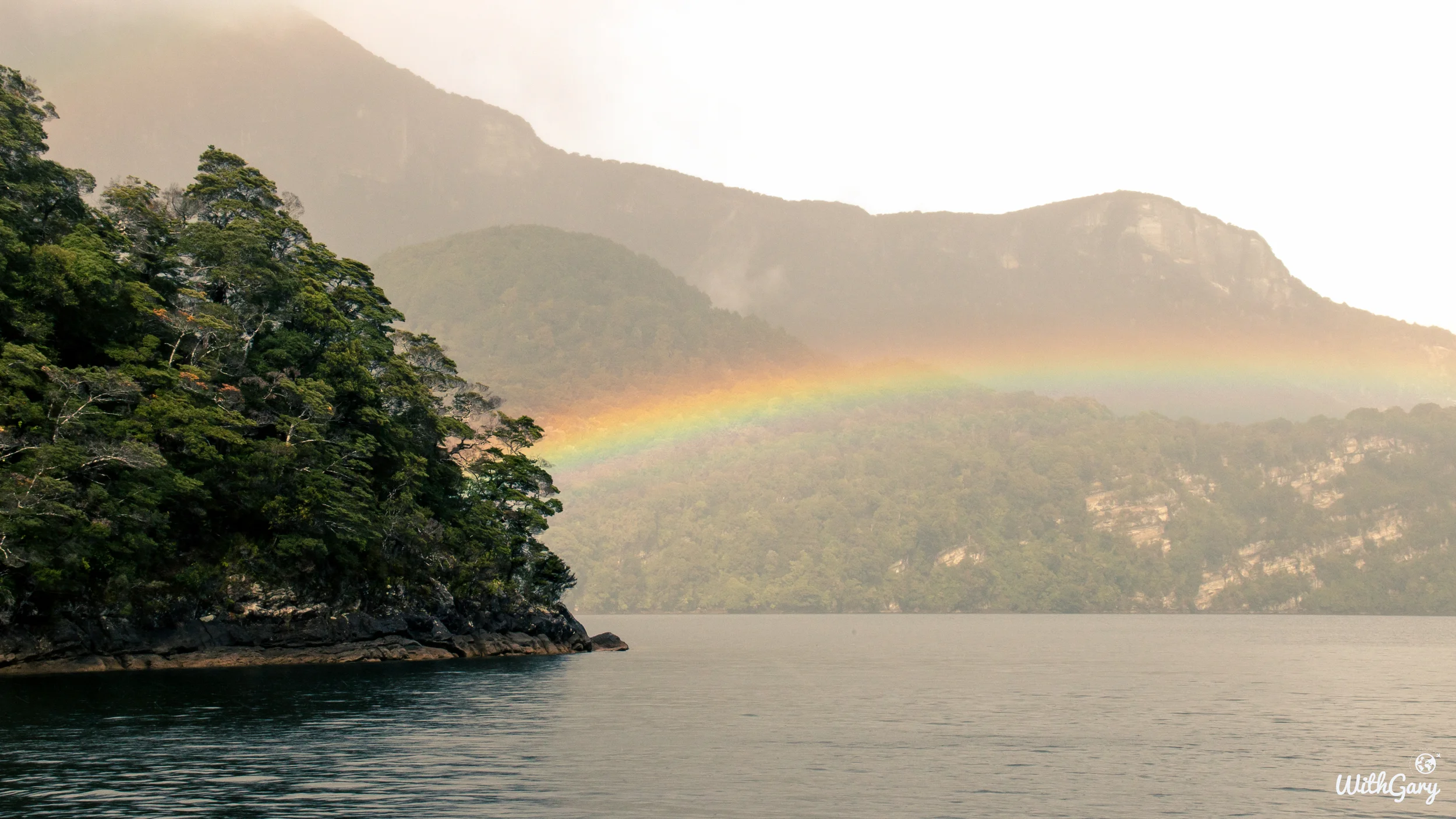On prend la route pour rejoindre l'embarcation qui nous mènera sur la route de Milford. Notre groupe composé d'une quinzaine de personnes monte à bord pour se diriger vers le début de l'aventure...en direction des nuages déversant leur pluie sur les fjords. Mais avec le soleil encore proche, on a la chance d'apercevoir de super arcs-en-ciel au ras de l'eau et à flanc de montagne. Même avec la pluie, la magie opère déjà !