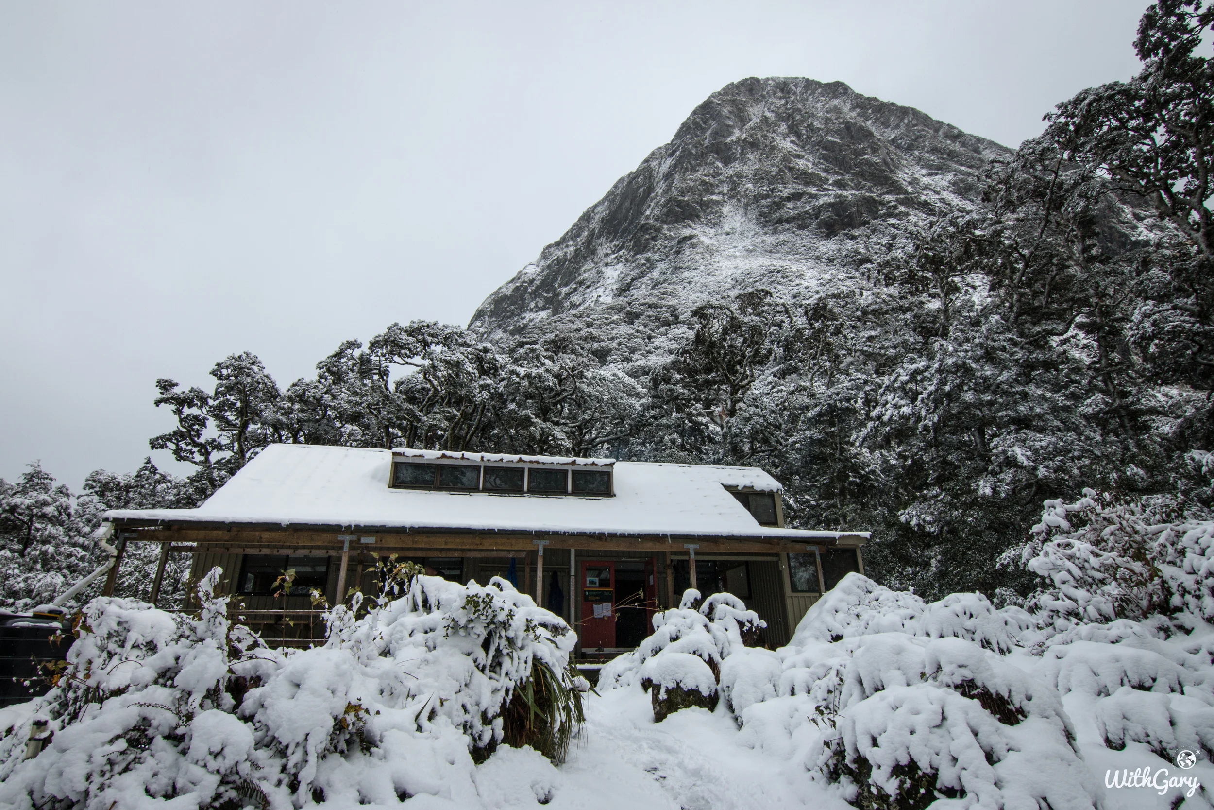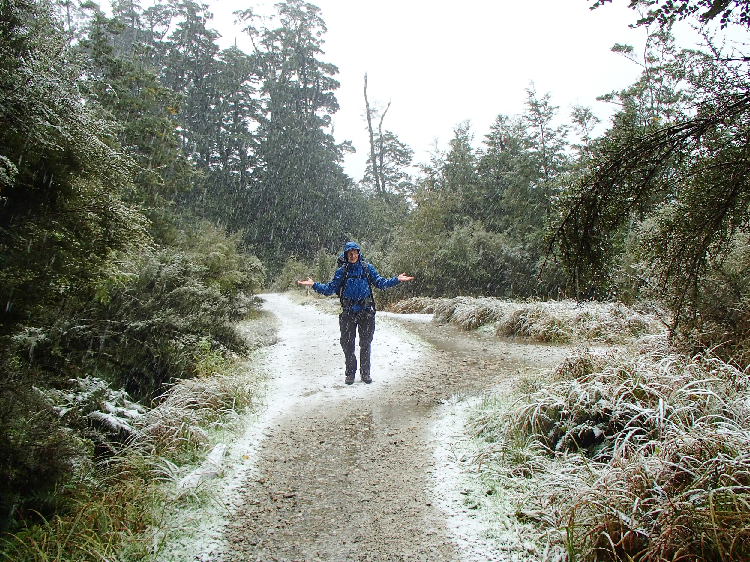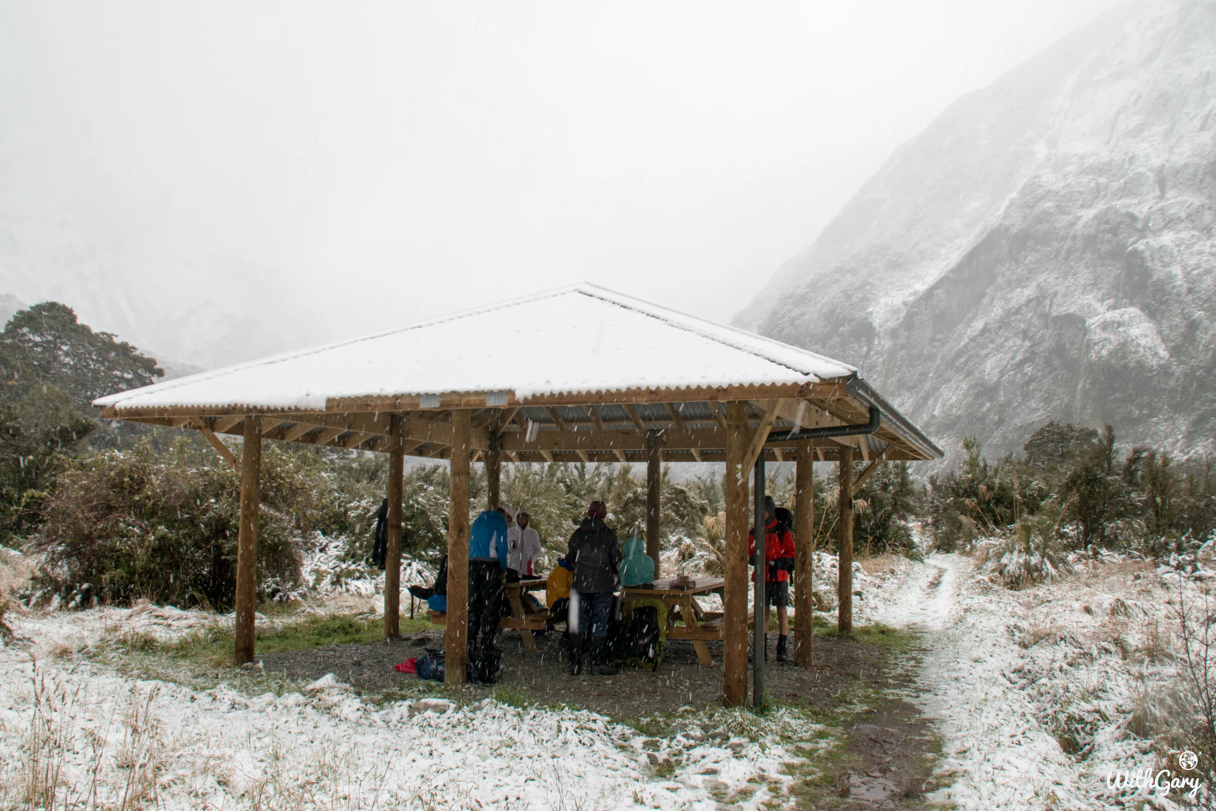 Le lendemain matin, Tom, le jeune ranger du refuge, nous informe que le DOC (Department Of Conservation) nous interdit à reprendre la route car il a trop neigé ces dernières heures et le col que nous nous apprêtons à franchir est inaccessible. En effet 1m50 de neige bloque le passage... Nous n'avions pas prévu de victuailles pour une journée supplémentaire, heureusement le refuge contient des vivres qui nous permettront de pallier ce manque.