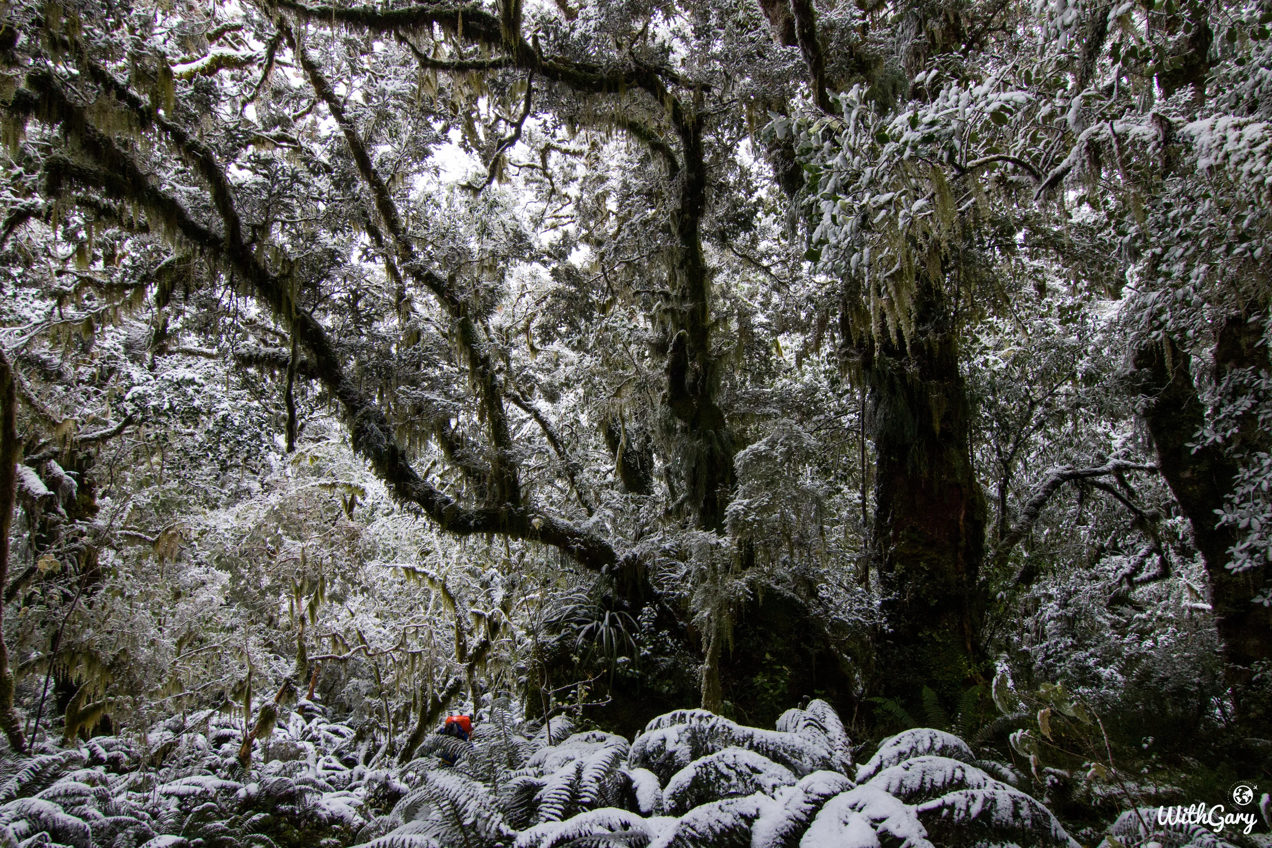 Ensuite il est temps d'entamer notre deuxième jour de marche, qui cette fois se fait sous de sérieuses précipitations de neige. C'est très couvert, donc la visibilité est pas super et la vue peu appréciable. Mais peu importe, la marche sous la neige a un goût particulier et c'est plutôt fun ! Les flocons rendent nos extrémités très froides et humides alors les pauses sont de courtes durée pour se réchauffer un maximum.