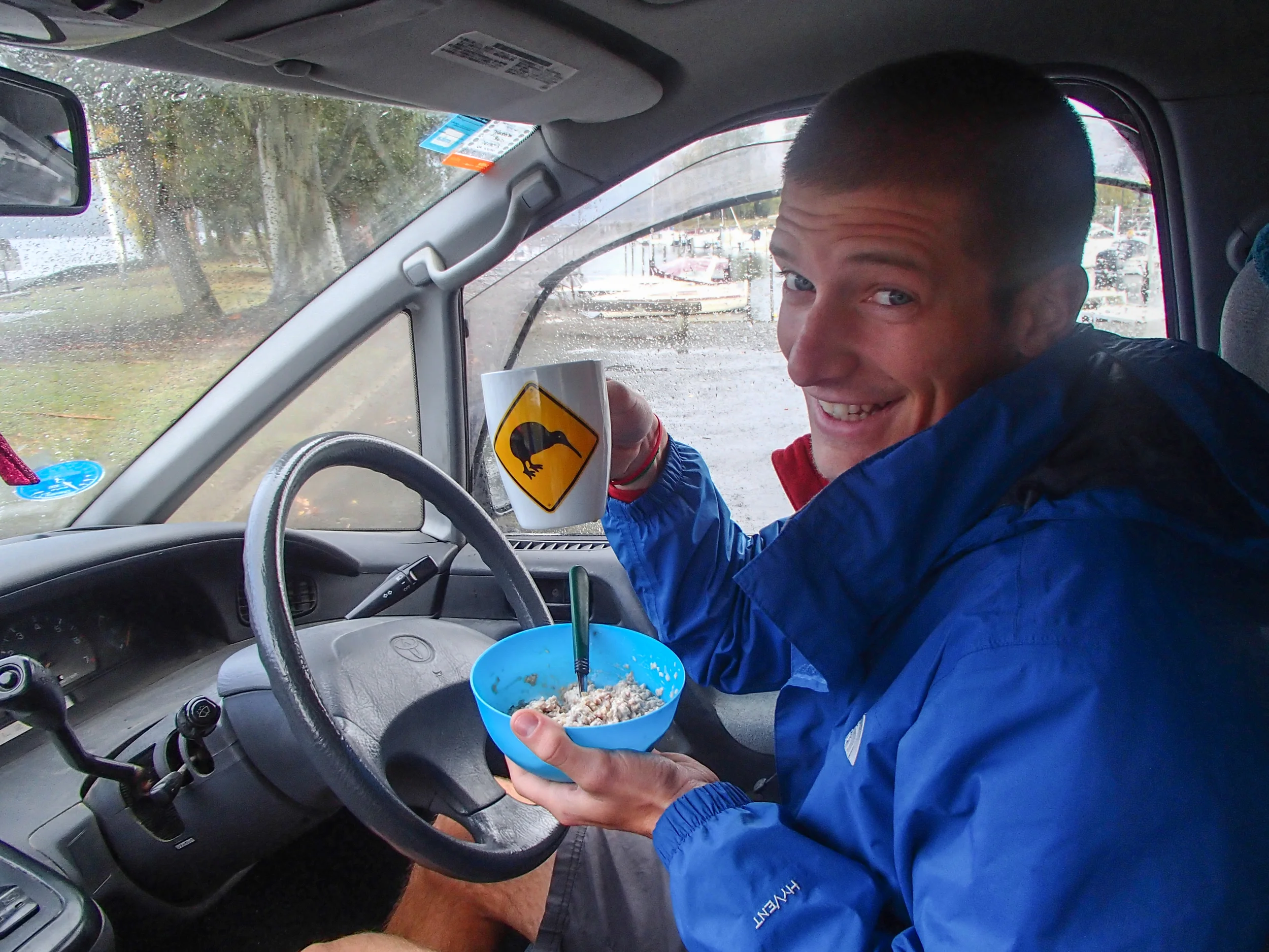 Bon, après avoir passé la nuit dans une ruelle de la ville de Te Anau, on se réveille sous la pluie, à moitié viré par un riverain nous menaçant d'appeler les flics. Et même si la pluie matinale nous contraint de prendre le petit déjeuner dans le van on garde le sourire pour cette aventure qui nous attend.