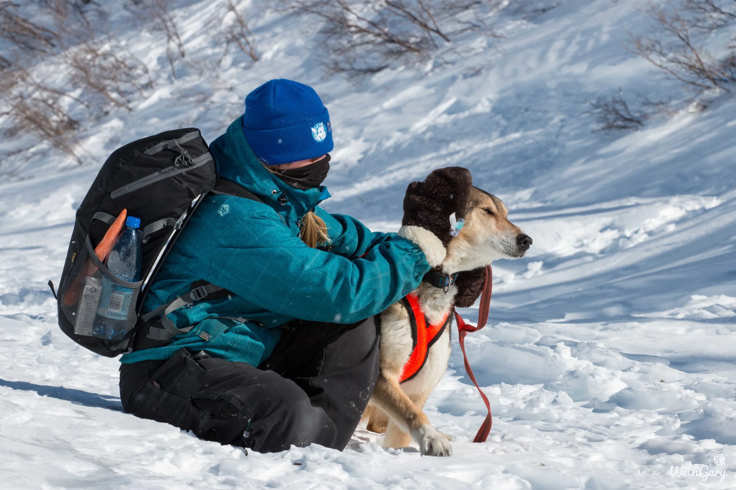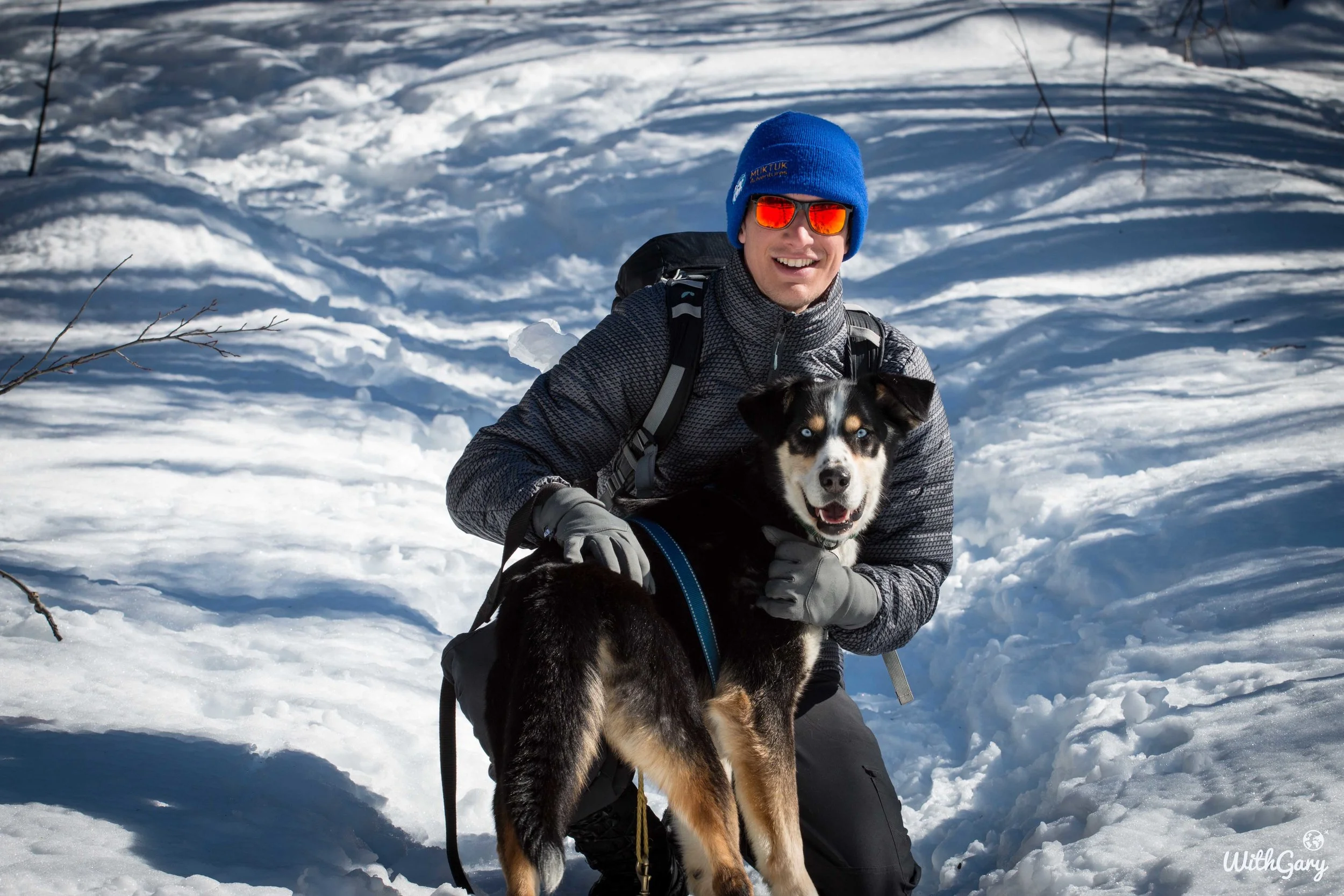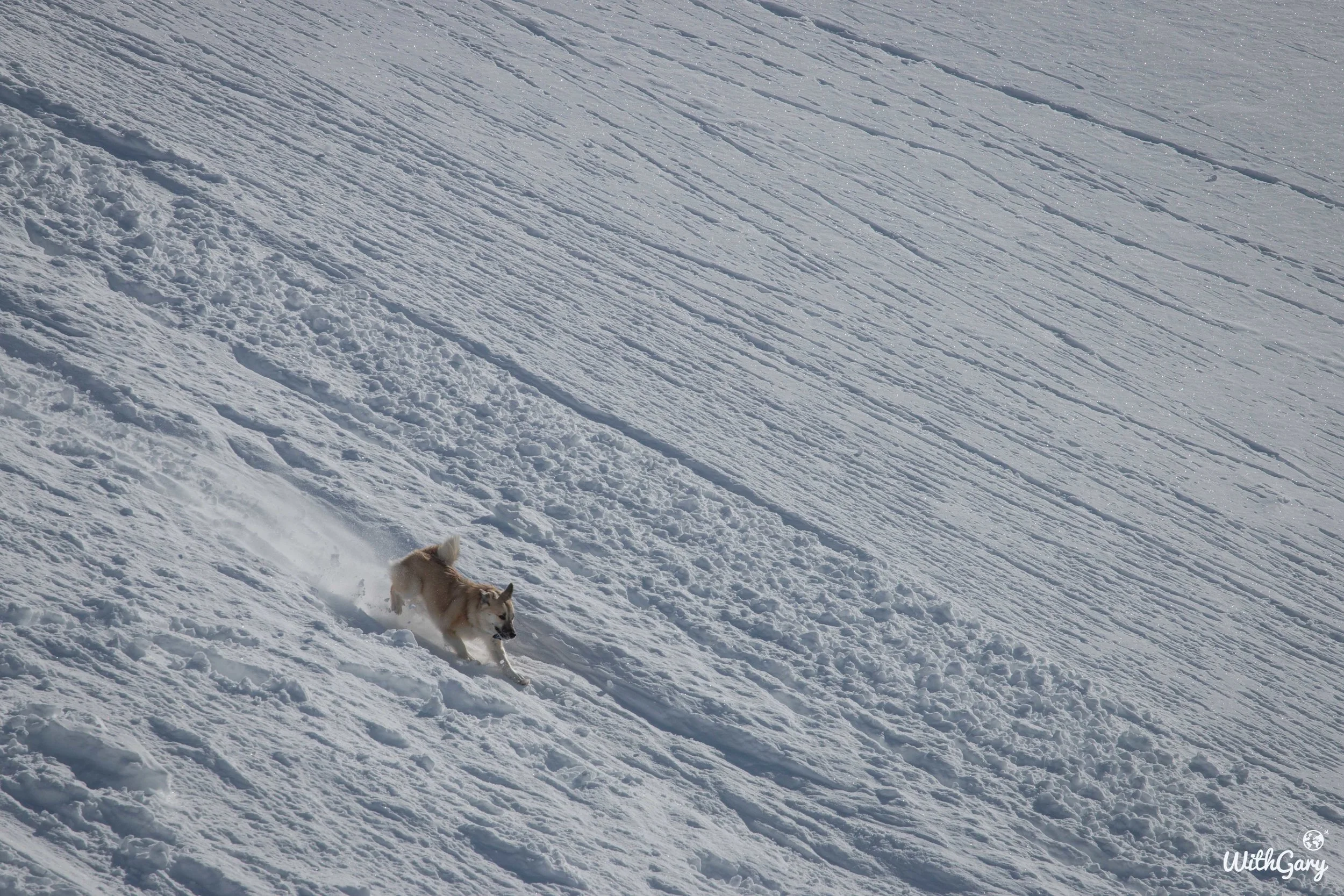 Comme vous pouvez le constater sur les photos, la neige est encore bien présente et les températures sont toujours fraiches. Mais cela ne nous décourage pas pour nous orienter vers une randonnée de 4 heures dans le parc. On préfère garder les chiens en laisse car on ne sait pas trop encore comment ils réagiront une fois ‘libre’. L’ascension débute sans accrocs, mais une fois que nous quittons la foret, le vent est redoutable et nous projette violemment les flocons au sol. En plus, le sentier n’est plus tassé et on s’enfonce jusqu’aux hanches à quasiment chaque pas. Copper, qui me tirait jusque là, se retrouve à se blottir contre moi à chaque arrêt. Il n’a vraiment pas l’air d’apprécier les rafales de vent. On décide finalement de rebrousser chemin et retourner à la voiture.