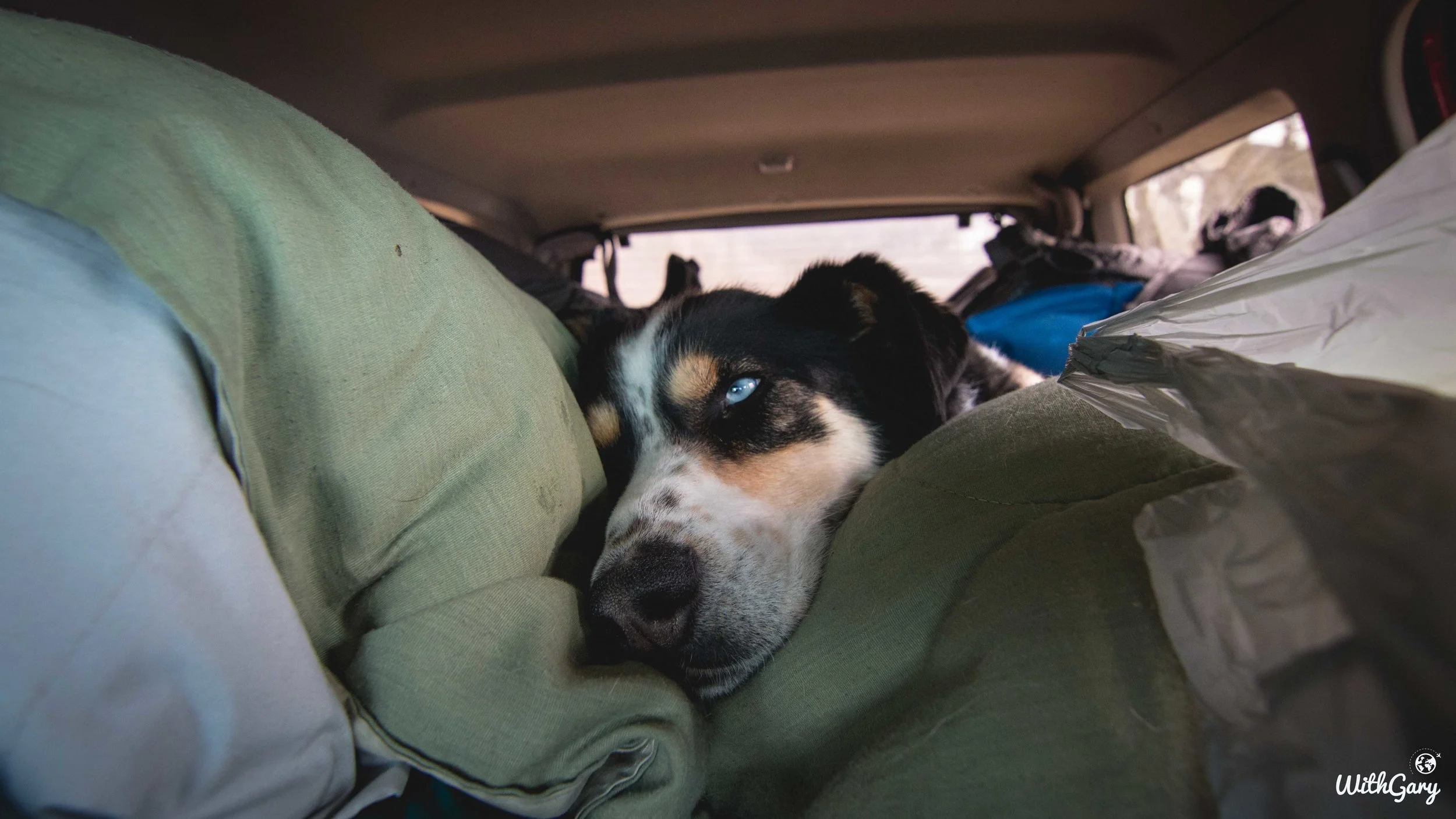 Les chiens sont très à l’aise pendant le trajet et trouvent facilement le sommeil. J’avais quand même fait un tour en ville avant notre départ pour observer leur comportement sur la route. Ils sont faits pour le road trip !