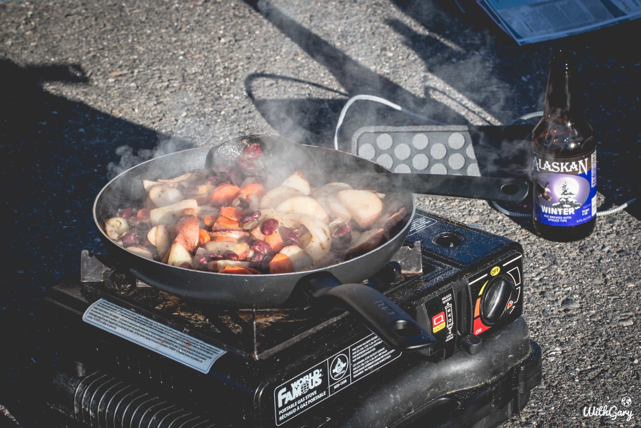 Réchaud, poêle, casserole, bouffe, eau; on a tout ce qu’il nous faut pour être autosuffisant. Il nous faut juste trouver un spot pour manger et dormir comme j’ai pu le faire en Nouvelle-Zélande.