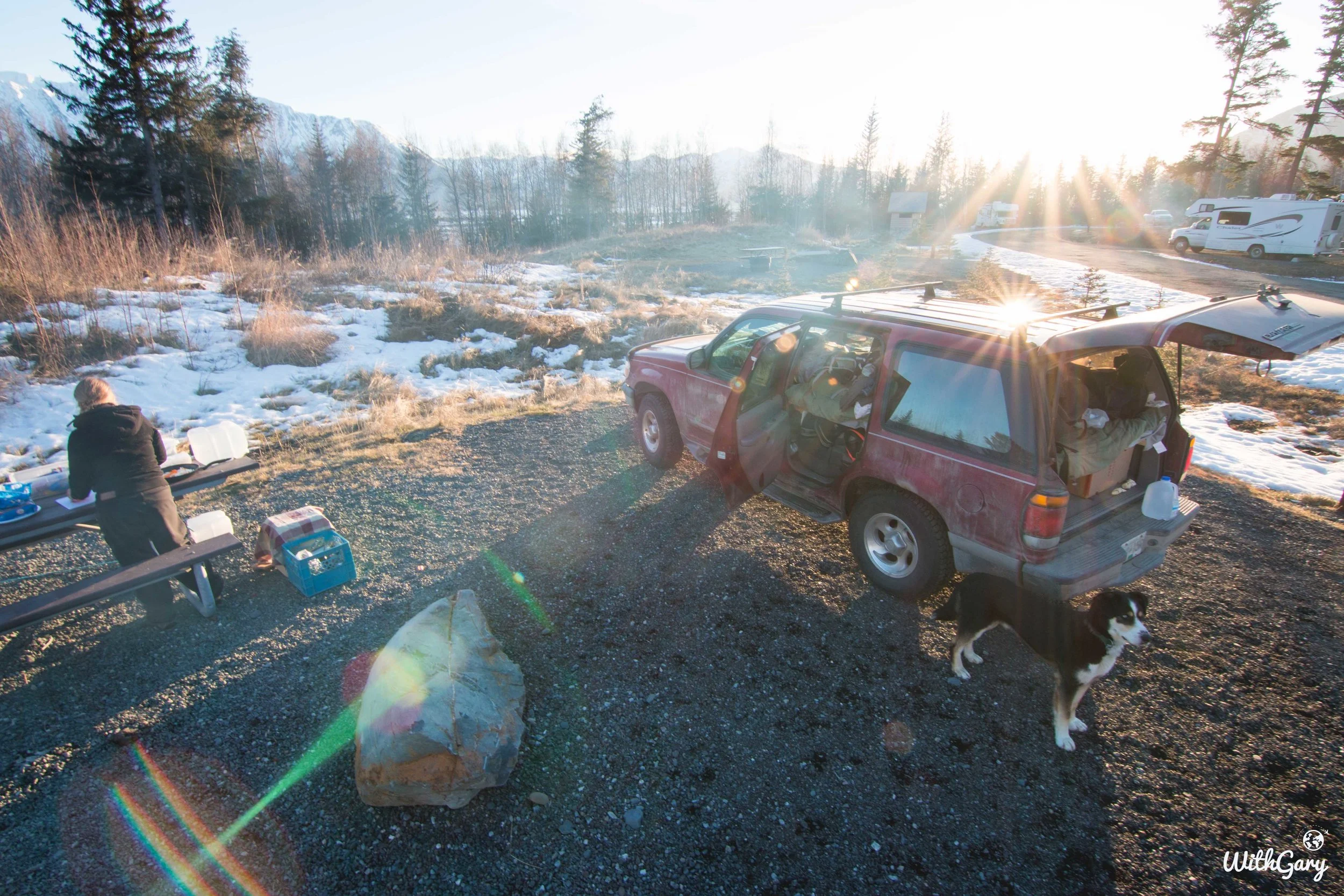On poursuit notre itinéraire vers Anchorage au sud de l’Alaska. C’est une ville immense cette fois qui nous attend, avec dix fois plus d’habitants qu’à Whitehorse. On arrive de nuit et l’on se gare dans un parc en périphérie du centre. En plein milieu de la nuit on se fait réveiller par un agent de police qui frappe à la vitre et nous demande nos passeports. Petit rappel que l’on est en Amérique, il nous demande également si l’on a des armes à feux… Après avoir contrôlé nos identités, il nous rend nos passeports et nous indique simplement que nous sommes en sécurité ici et que si nous avons quelques soucis on pouvait les contacter. Nous qui nous attendions à se faire virer du coin, c’est une belle surprise qu’il nous fait. Pendant tout ce temps Copper grogne à l’approche du flic de la voiture pendant que Jonas reprend son sommeil. Mais encore une fois cet agent fait preuve de beaucoup d’intelligence et de sympathie et nous dit qu’il comprend que le chien veuille protéger son territoire. Vraiment cool la police en Alaska !